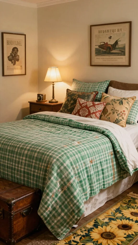 Vintage-inspired green checkered bedding makes nostalgia feel fresh again. Pair the softly faded pattern with antique furniture and retro lighting to create a cozy, modern retro vibe. Add a vintage suitcase or patterned throw pillows to personalize your space without sacrificing today’s comfort.