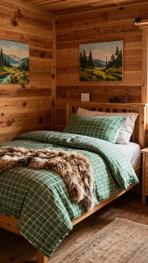 A cabin-inspired bedroom with green checkered bedding is about comfort and creating a tranquil atmosphere for restful nights.