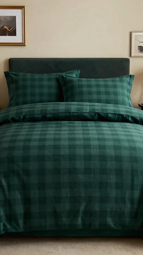 If you’re eager to make a bold statement, dark green checkered bedding is a striking choice. The depth of dark greens lends a luxurious feel to the room, especially when paired with gold or brass accents. This dramatic color palette establishes sophistication and style in your bedroom.