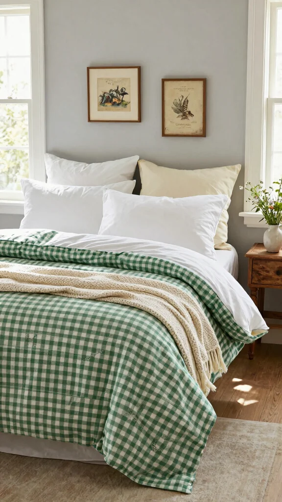 Consider scale when selecting a gingham pattern for a cottage look: tiny checks feel cozy in small rooms, while medium checks can add character in larger spaces. Look for patterned duvet covers that coordinate with your palette, or choose gingham bedding sets in complementary greens and neutrals. Shop from brands focusing on green home textiles and you can find pieces that suit cottage style decor and even farmhouse bedroom ideas.