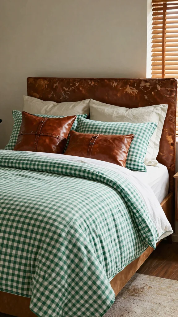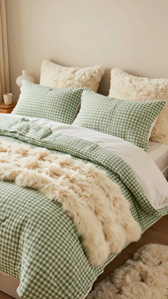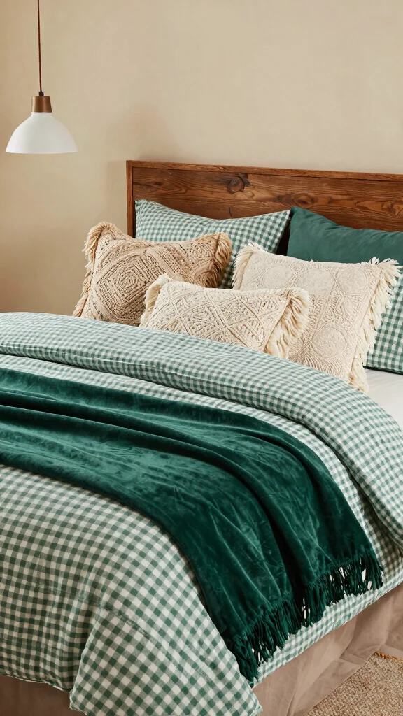 Combine green gingham with different textures, like linen or faux fur, for a cozy, layered bedding experience.
