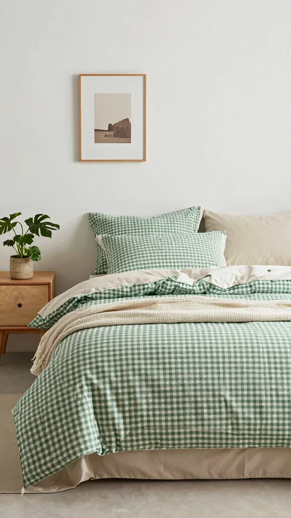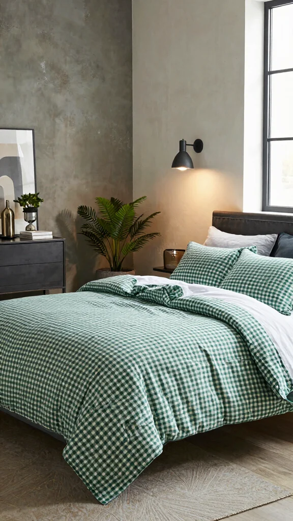 To achieve this minimalist look, select a green gingham duvet that serves as the focal point. Pair it with neutral sheets and a single textured throw for a clean aesthetic, and incorporate minimal decor, such as a few well-placed plants or a single piece of artwork. Keep furniture pieces streamlined to maintain an unobtrusive atmosphere that allows the bedding to shine.
