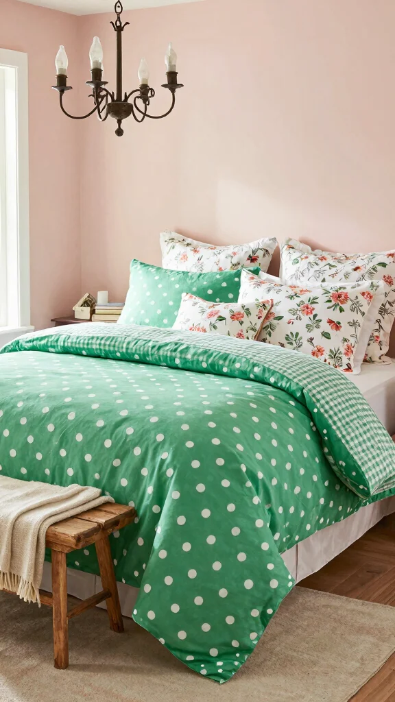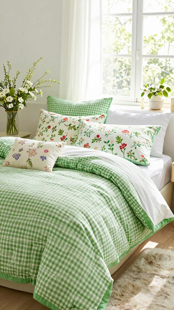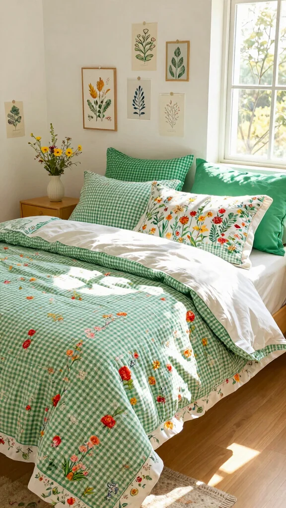 Here are some tips to create a balanced look: Use a dotted green gingham duvet as your base layer. Layer floral pillowcases or shams to introduce subtle color without overwhelming the space. Incorporate a soft, solid-color throw blanket that complements the green tones, and keep surrounding decor simple to let the patterns shine.