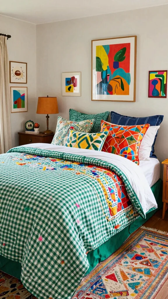 For those who love to explore different styles, creating an eclectic mix with green gingham bedding can result in a uniquely personal bedroom decor. This approach allows you to showcase your personality through a variety of textures and patterns, resulting in a lively and creative atmosphere.