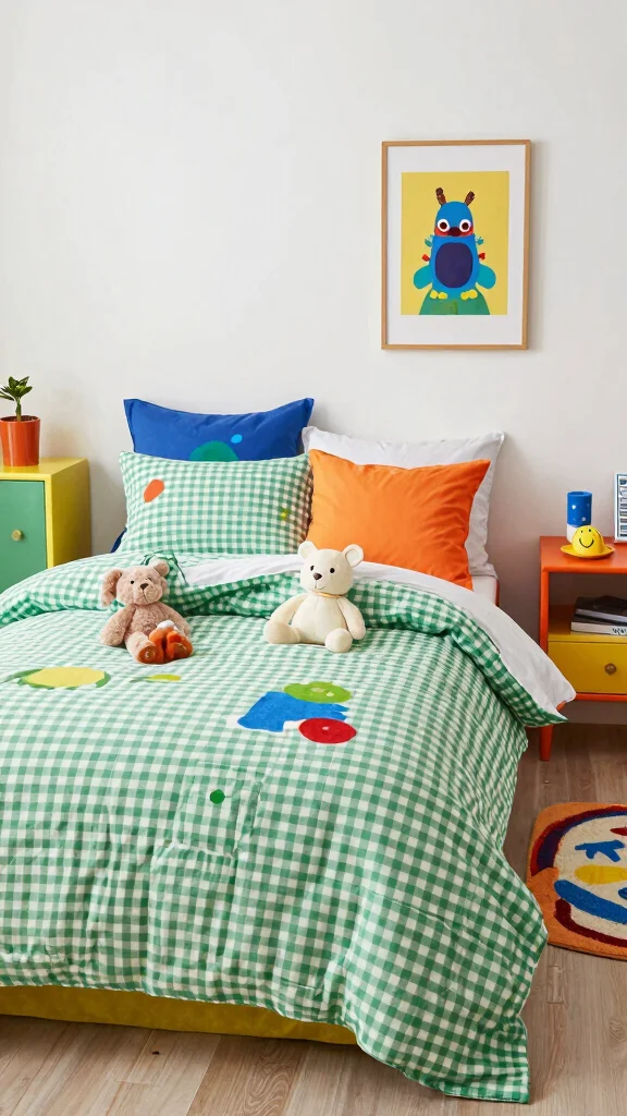 To style a kids’ room with gingham bedding, start with a green gingham duvet as the centerpiece, pairing it with playful pillow designs—think bright colors or fun characters. Add soft toys and plush blankets to foster a cozy feel, and incorporate fun wall art or decals that complement the bedding pattern. Consider using colorful furniture that is both functional and playful to tie the room together.