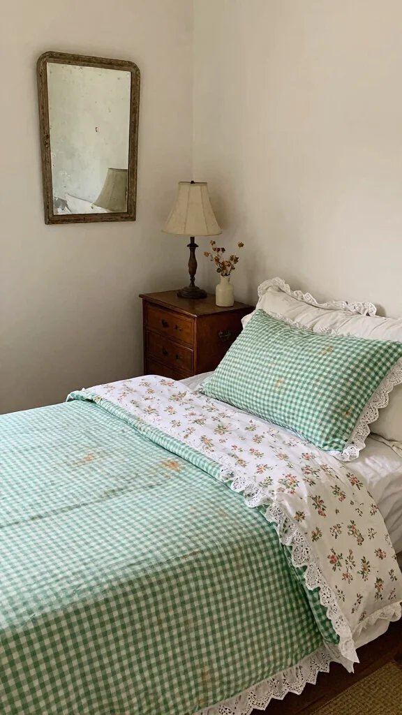 Start with a gingham duvet cover that shows a slight fade or distressed look for added charm. Pair it with vintage floral sheets or lace trim to enhance the beauty. Incorporate antique furniture, like a weathered nightstand or ornate mirror, and consider using vintage-inspired lighting to complete the nostalgic feel.