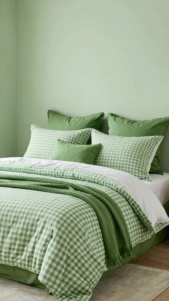If you prefer a cohesive design, a monochromatic green gingham theme can make a striking statement in your bedroom. Utilizing varying shades of green adds visual interest while maintaining a unified appearance. This approach creates a fresh and modern feel that still feels inviting.