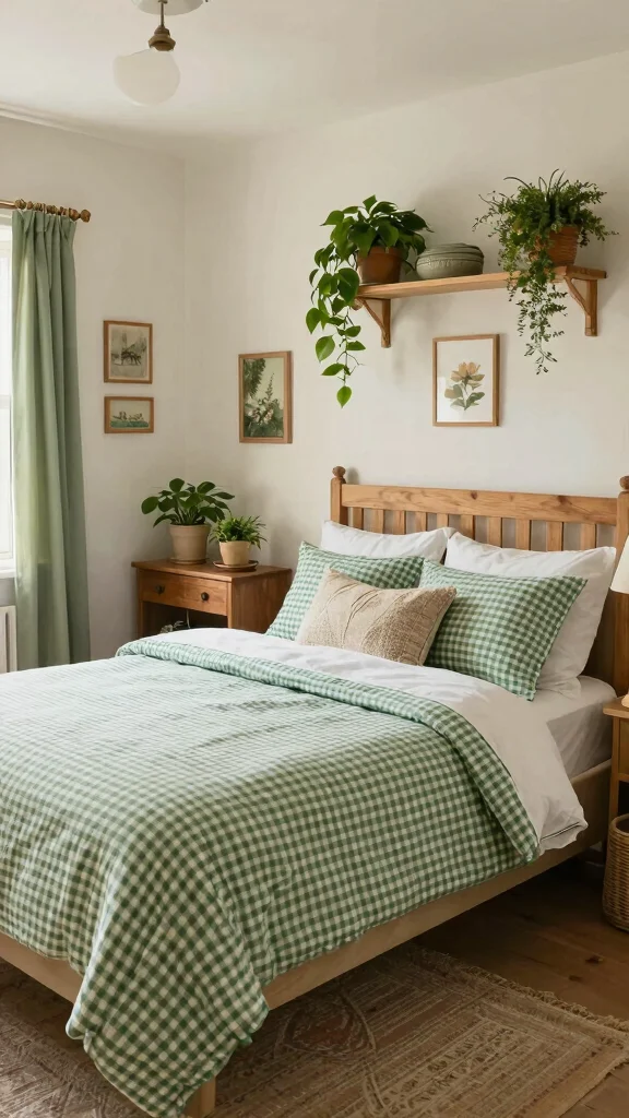 Bringing nature indoors is a key element in cottage-style decor, and green gingham bedding pairs beautifully with vibrant botanical accents. This combination not only enhances your bedroom’s aesthetic but also promotes a calming atmosphere. Incorporating plants can elevate your decor and improve air quality too!