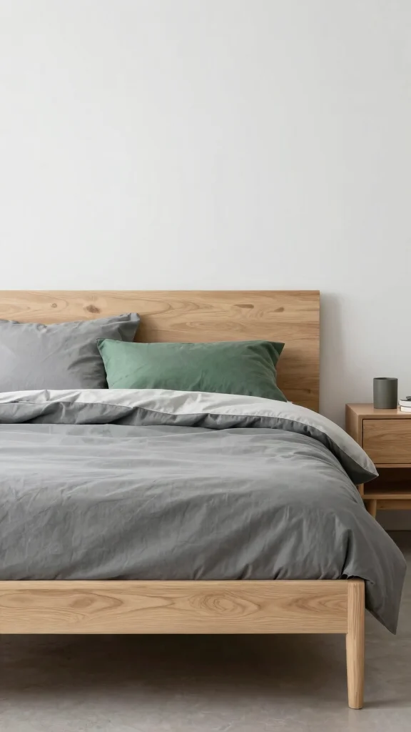 Begin with a cooling grey base and introduce neutral color palette accents through pillows, throws, and a duvet cover in range of greens. For modern bedding ideas, mix solid pieces with subtle textures like linen, velvet, or ribbed cotton. Keep clutter low to preserve bedroom inspiration and let the bedding be the star. Add natural materials such as wood nightstands and a jute rug to keep the look cohesive and calm, then finish with one or two plants to bring in life without breaking the minimal vibe.