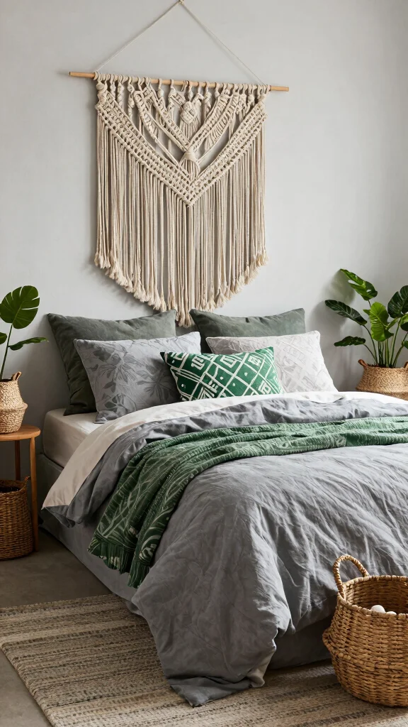 If you want to infuse a bit of whimsy into your bedroom, consider adding boho accents to your grey and green bedding. Elements like textured macramé wall hangings, woven throws, and vintage-style pillows can create a casual and eclectic vibe that feels inviting and warm. Mixing different patterns and textures is essential to capturing that bohemian spirit.