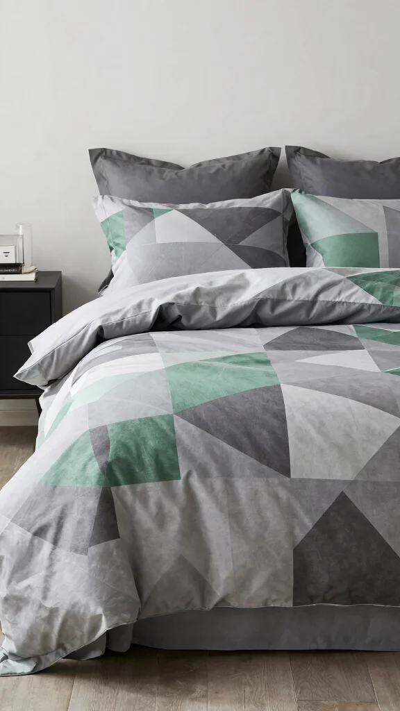Inject a modern flair into your bedroom with contemporary geometric patterns in grey and green bedding. This style adds a playful yet sophisticated touch that can serve as a striking focal point. Look for bedding featuring bold shapes and lines in these colors to create a dynamic visual impact.
