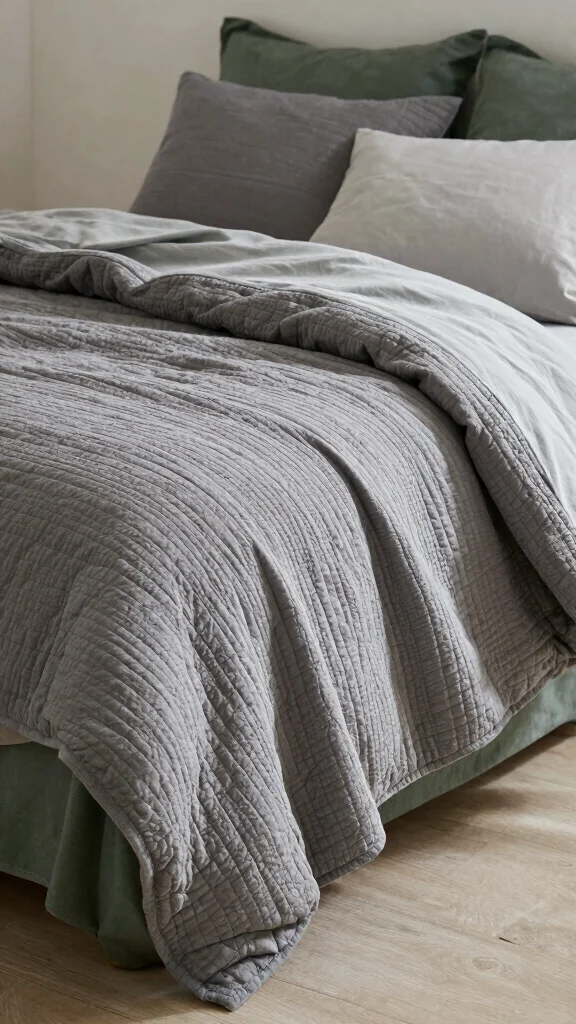 Textured quilts are a fantastic way to add coziness and depth to your bedding ensemble. A quilt in shades of grey with green accents serves beautifully as a bedspread or a layering piece during colder months. Opt for quilts made from organic or recycled materials to align with your sustainable vision.