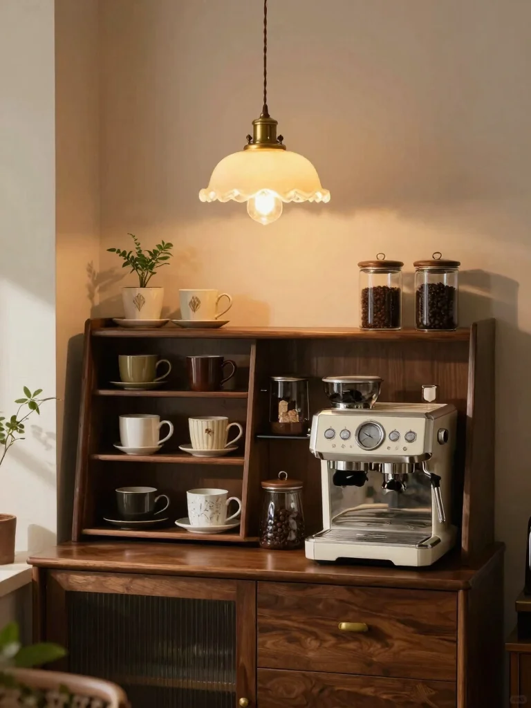 This lighting choice illuminates your coffee station while enhancing the overall decor of your living space.