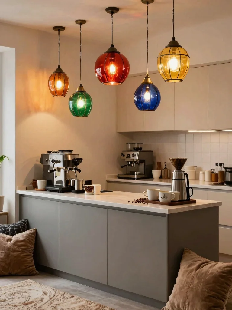 Want to brighten up your coffee nook? Colorful glass shades are a fantastic way to add a splash of color while providing a warm light. Look for shades made from stained or frosted glass for a unique touch that creates a cheerful focal point.