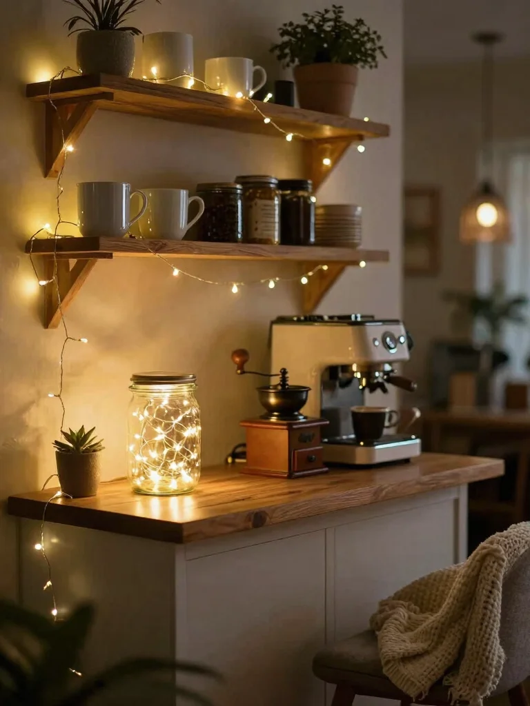 Ready to turn your coffee station into a cozy retreat? Fairy lights add a magical twinkle that instantly transforms your space. You can string them around shelves or inside glass containers to create a whimsical glow. Opt for warm white lights for a classic look, or use vibrant colors for a playful touch that brightens your mornings.