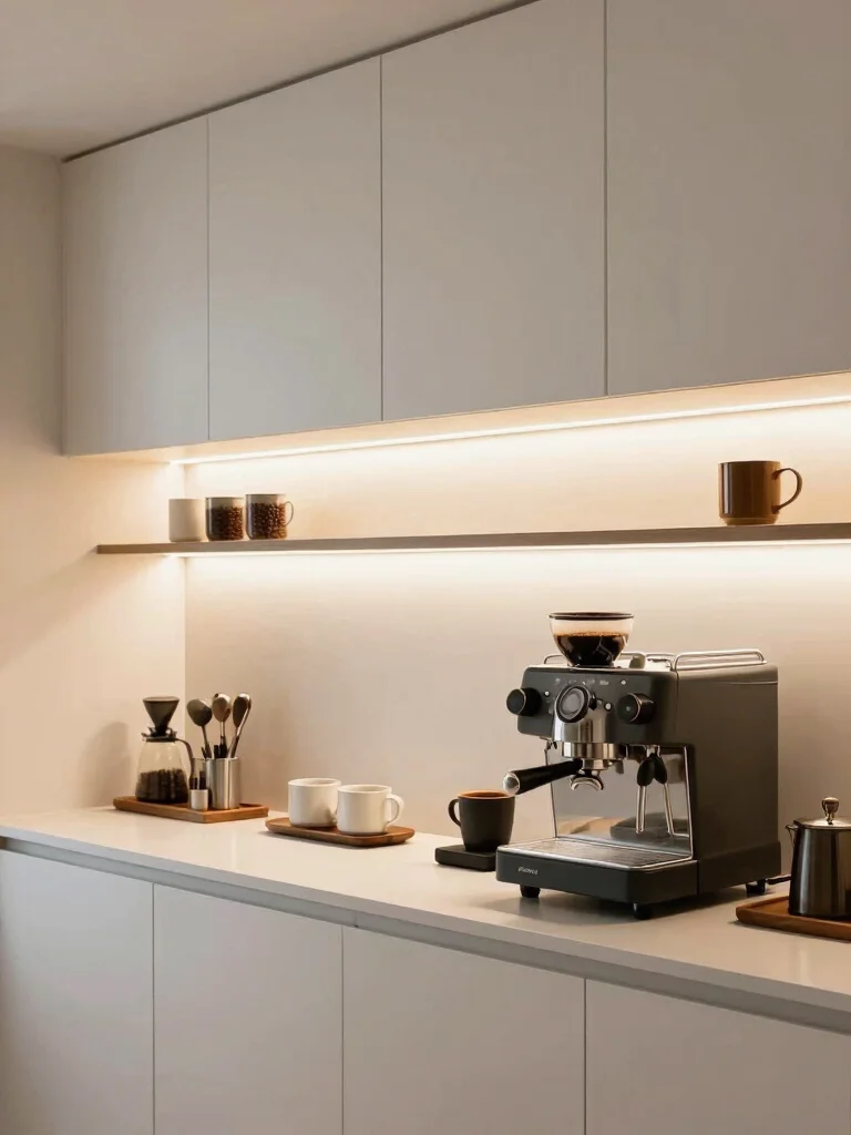 Have upper cabinets in your coffee nook? Installing LED strip lights underneath can brighten your workspace while adding a modern touch. These lights create a layered effect, making your area feel more inviting. Choose warm white LEDs for a soft glow that complements your decor.