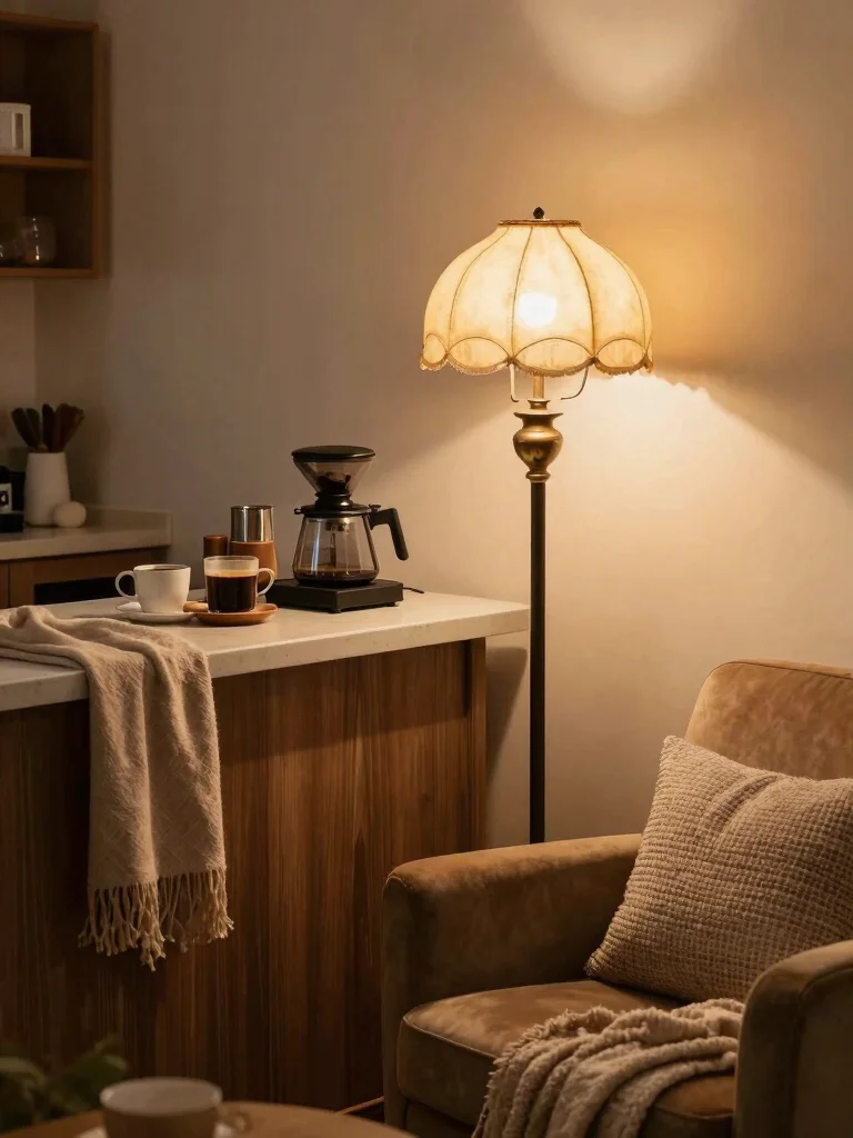 Answer: Textiles do more than look pretty — they absorb and soften light, creating a welcoming glow around your coffee station. For a cozy living room setup, layer in textiles like a woven runner, a soft cotton napkin set, a wool throw draped nearby, and a fabric lampshade to diffuse harsh light. Choose warm tones (creams, taupes, ambers) and natural materials (linen, jute, wood) to amplify warmth. Place a small fabric-covered shade lamp on the side and a textured rug underfoot to reflect light gently. This home coffee station lighting idea pairs nicely with warm fabrics to create an inviting, tactile space.