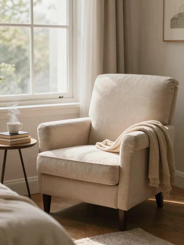 To create your nook, position a comfortable armchair or chaise near a window to take advantage of natural light. Add a small side table for books or drinks, and use soft lighting, like a floor lamp, to create an inviting atmosphere. Personalize the nook with pillows or throws that match your bedding for a cohesive look.