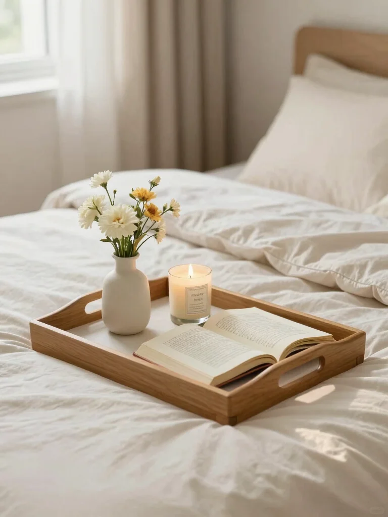 When selecting a tray, choose one that aligns with your overall decor style, whether it’s wood, metal, or woven. Position it centrally or to one side, and fill it with items like a small vase or your favorite book. You can even use it for breakfast in bed, making mornings feel special.