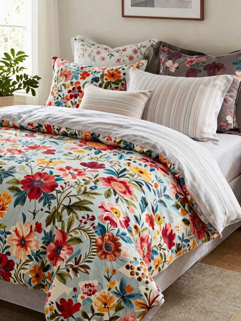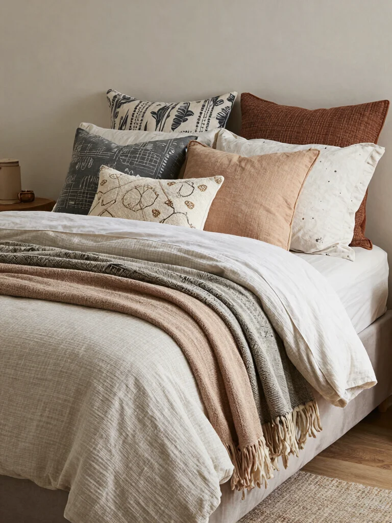 A great rule of thumb is 2–3 patterns. Use one large-scale print as the anchor, a medium print as the supporting layer, and a small-scale pattern or texture as an accent. Tie them together with a shared color from your bedding styles palette, then add patterned duvet covers and coordinating throw pillows in solid colors to balance the scene. If you’re unsure, start with a neutral base and build your pattern mix gradually.