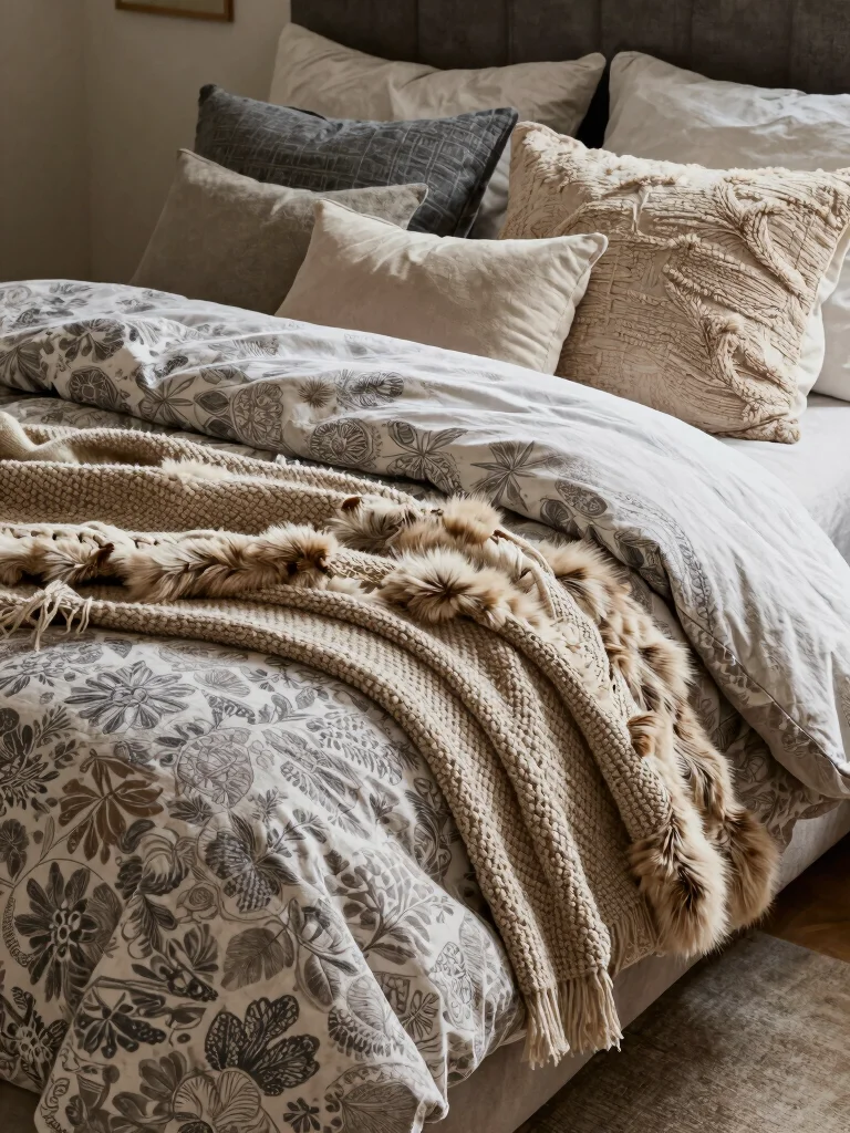 Mix and match bedding patterns with confidence. Start by color-blocking your duvet, then pair with solid sheets in complementary shades. Keep the palette limited to 3 colors to stay polished, and add texture with knits or velvets for instant depth.