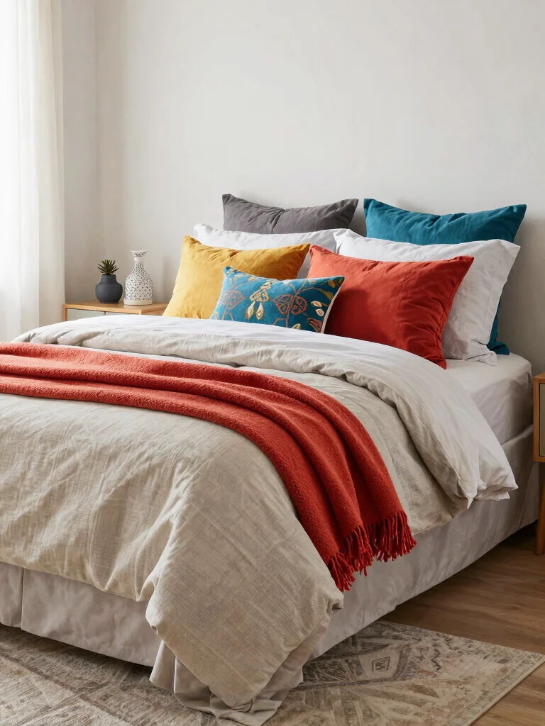 You don’t need a full overhaul to get a stylish, eclectic look. Reuse existing pieces and swap in a few patterned duvet covers or new coordinating throw pillows to refresh your bed. Shop sales, explore second-hand finds, or DIY pillow covers to cut costs. Focus on a tight color palette and let the patterns do the talking, then add stylish bedroom accessories like a textured throw or small plant for a quick, budget-friendly upgrade.