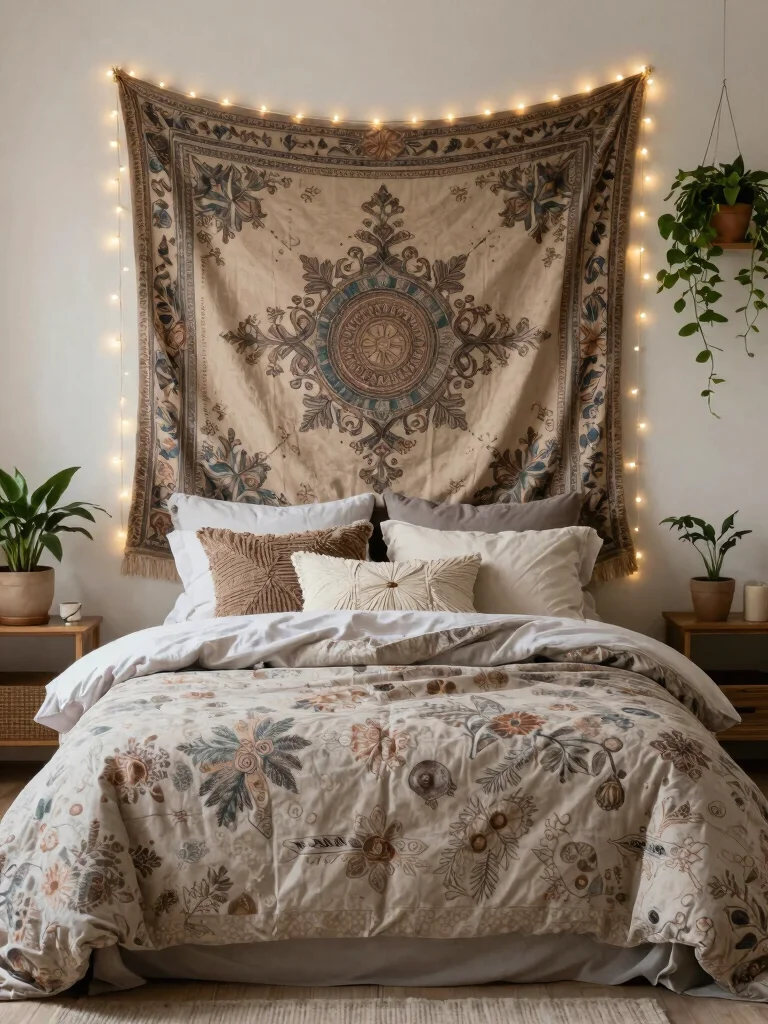 Enhance your bohemian style by layering your bedding with beautiful wall tapestries. Use a tapestry as a backdrop for your bed, creating a stunning scene for eclectic layers of bedding. Choose patterned duvet covers and textured cushions that harmonize with the tapestry’s colors for a cohesive look.