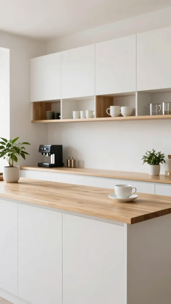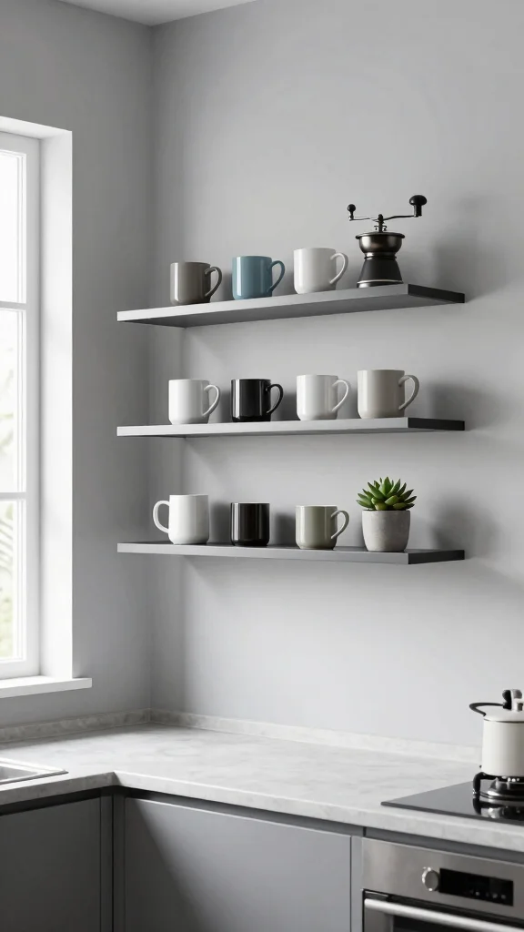 Floating shelves embody the essence of minimalist design, effortlessly blending style with functionality. They allow you to display your favorite coffee essentials while keeping your space open and airy. Imagine mounting sleek wooden shelves just above your coffee machine, showcasing neatly arranged mugs, a vintage grinder, and perhaps a small potted plant for a touch of life. This combination not only looks chic but also enhances visual harmony in your kitchen.