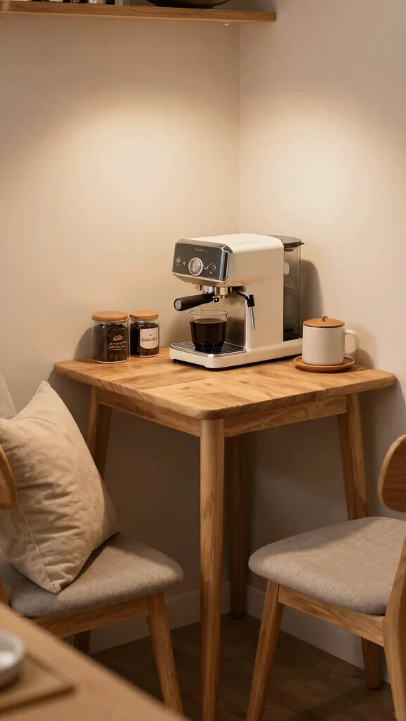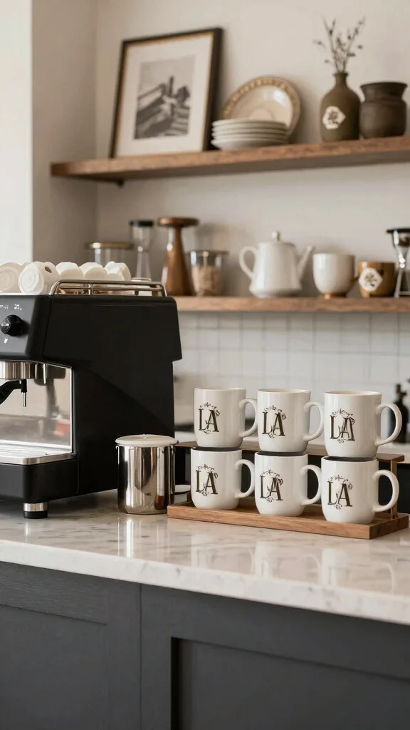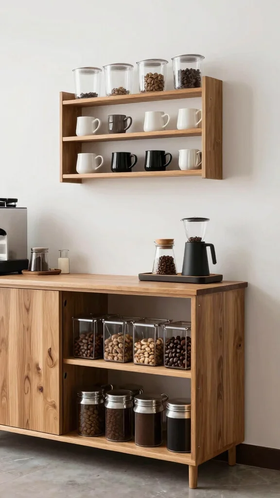 This approach not only minimizes clutter but also creates a spacious feel, making your coffee area both stylish and functional.