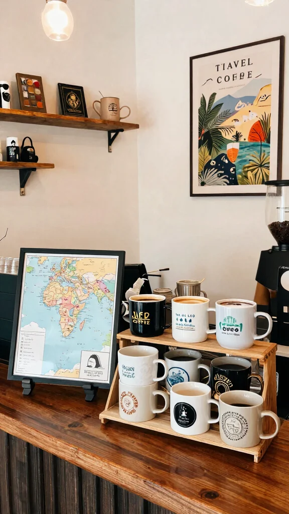 To enhance this travel theme, use decorative boxes from your adventures for storage, and include a small globe or travel-themed art that adds a unique touch to your coffee bar. This creative setup allows you to share stories and experiences, making each cup of coffee a reminder of adventure.