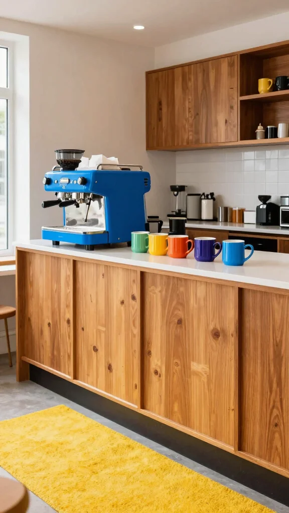 Bold colors ignite a kitchen’s energy, turning a simple coffee bar into a daily mood boost. Fun fact: vibrant hues can make small spaces feel larger and more inviting. Pro tip: mix a striking blue or radiant yellow with contrasting accessories for instant personality in your modern coffee bar ideas.