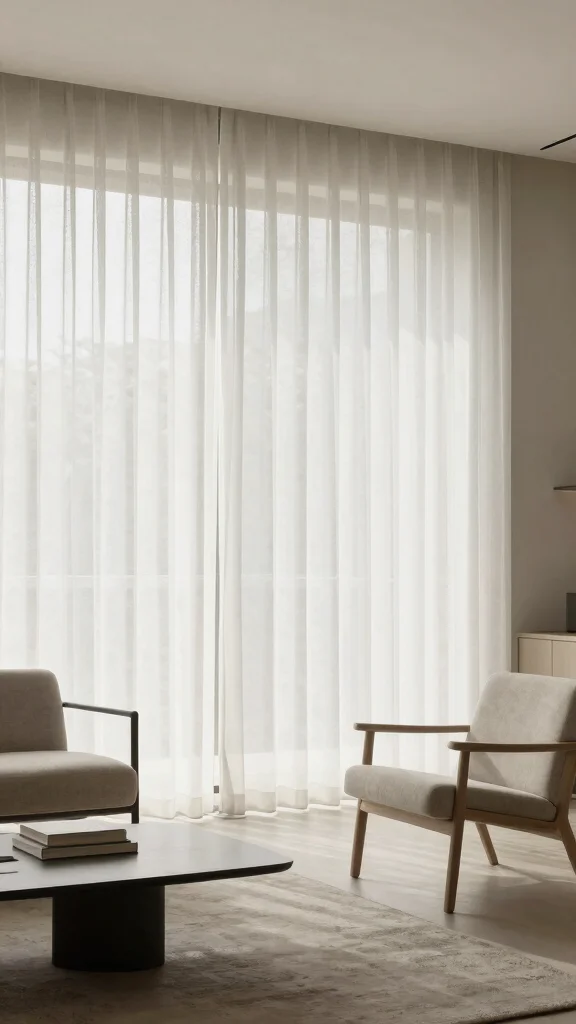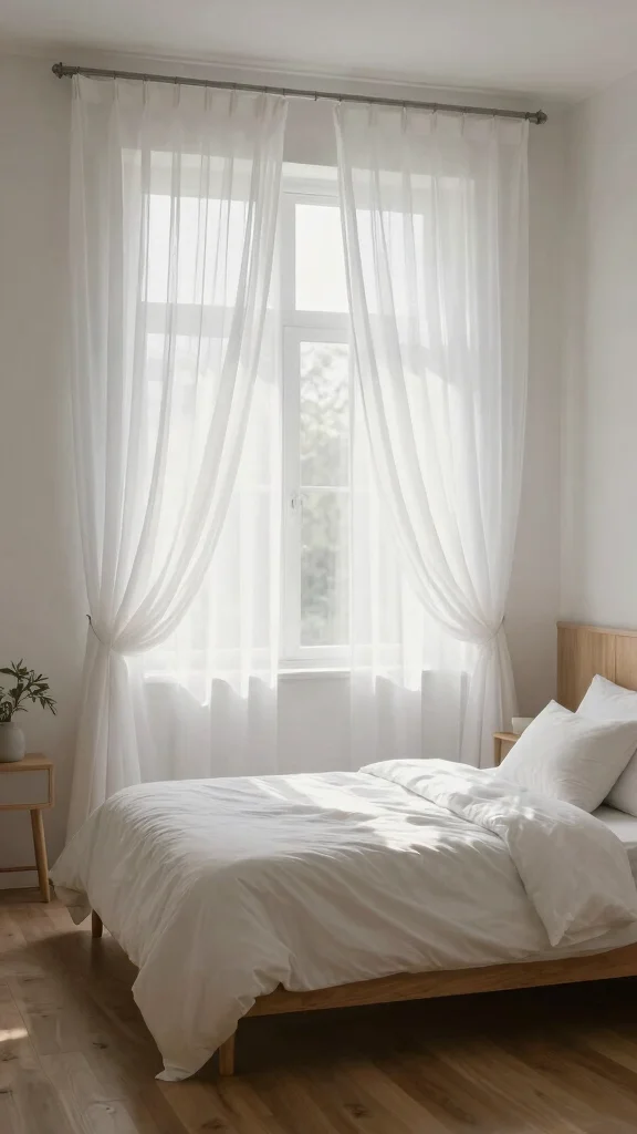 For an airy curtain styles vibe, keep everything light and simple. Use airy curtain styles with neutral tones and clean lines. Layer a sheer with a subtle light-filtering drapes to manage privacy without heaviness. Hang the rod higher and wider than the window to maximize light and create the impression of larger windows, a staple of minimalist home decor. Choose hardware with a slim profile to maintain a sleek look, and let the natural textures of the sheer fabric design shine.