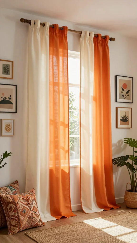 Layering orange sheer curtains with other light fabrics captures the essence of bohemian design. This approach adds texture and visual interest while allowing soft light to dance throughout your space. Try combining orange sheers with creamy whites or earthy browns to create a cozy, inviting atmosphere. Mixing various curtain lengths enhances that relaxed, collected vibe, making your home feel more personal and eclectic.