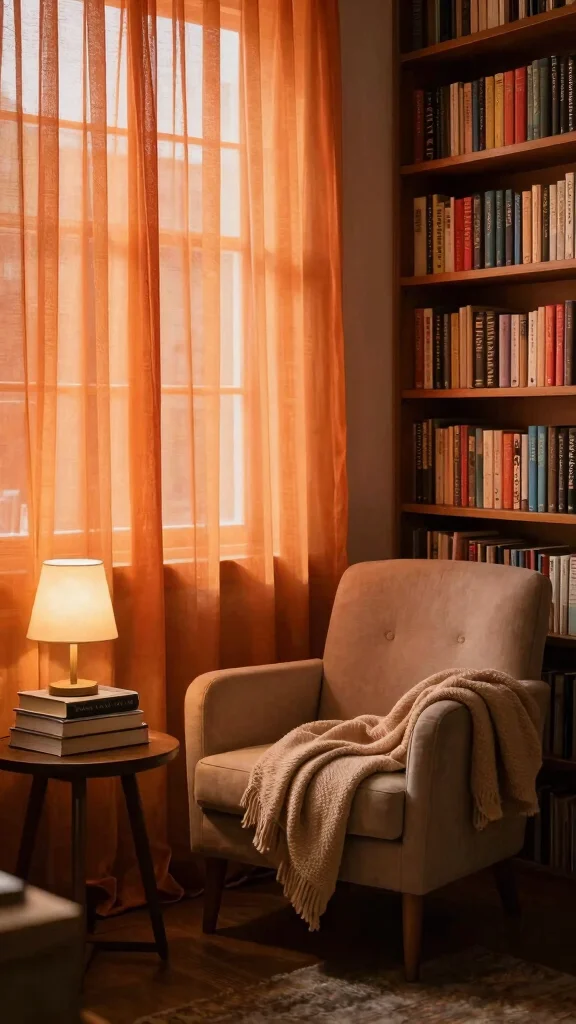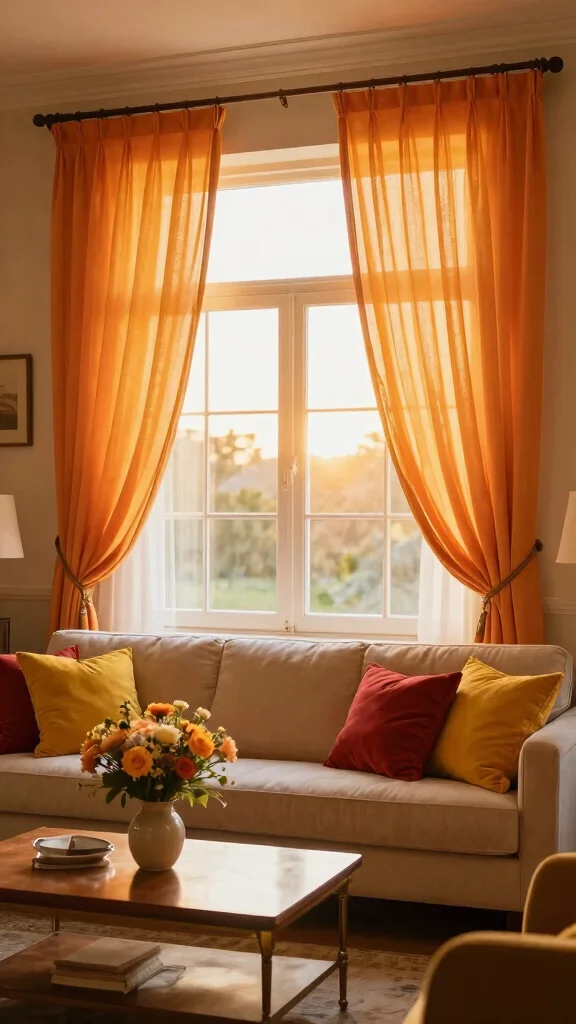 Fun fact: orange sheer curtains can make a sunset-inspired living room feel up to 20% warmer by filtering light with a golden glow. Pair them with golden-yellow cushions and deep red vases to amplify the cozy, welcoming vibe. Pro tip: hang curtains higher to boost ceiling height and airiness.