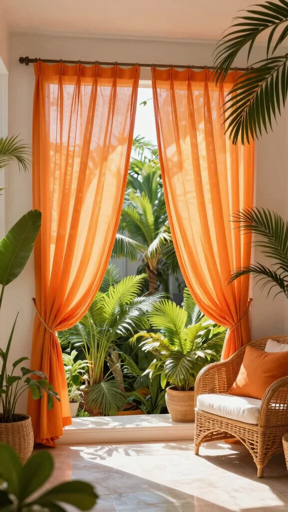 Bring a tropical feel to your home with orange sheer curtains that transport you to a sun-kissed paradise. Pair them with palm leaf prints or vibrant tropical motifs to create a lively atmosphere. This combination is perfect for sunrooms or any space where you want to celebrate life and color. Add bright green plants and natural wood decor to complete the look, bringing those outdoor-inspired vibes inside your home.