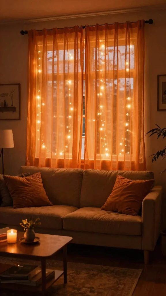 Use orange sheer curtains to evoke sunset colors, enhancing a cozy and inviting atmosphere in your living room.