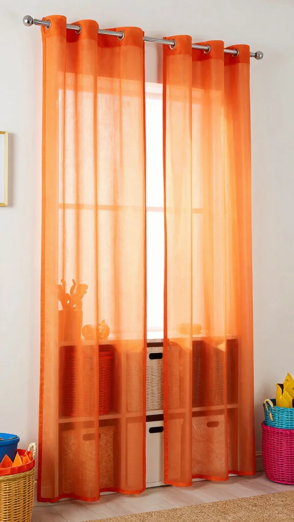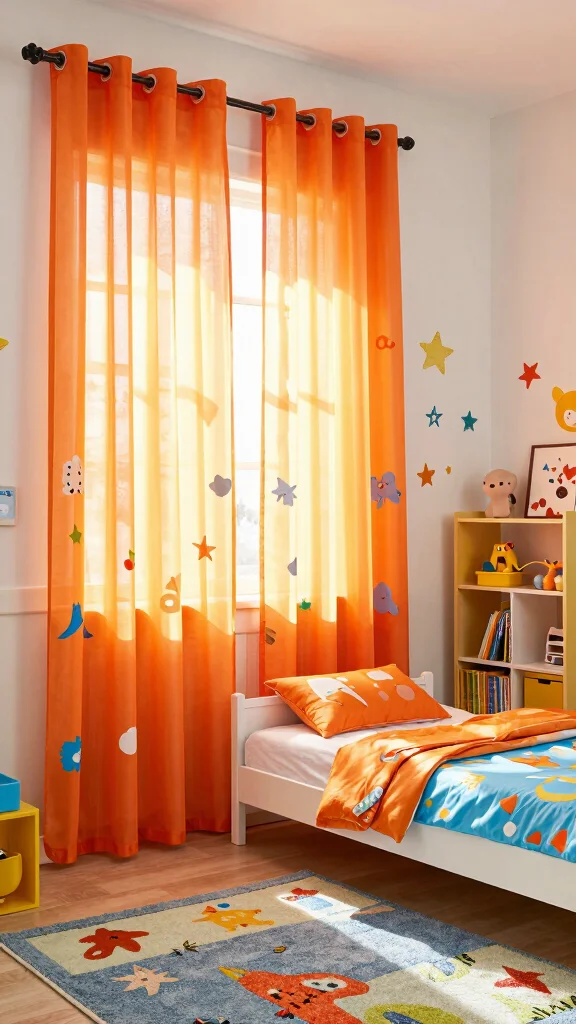 Brighten your child’s room with playful orange sheer curtains that spark creativity and joy. This lively hue is perfect for a vibrant kids’ space and can be paired with whimsical patterns such as stars or cartoon characters. Opt for lightweight curtains that are easy to open, allowing your little ones to let in the sunshine. Bright, cheerful decor items like colorful rugs and playful wall decals can enhance the fun atmosphere, making their room a magical place to play and dream.