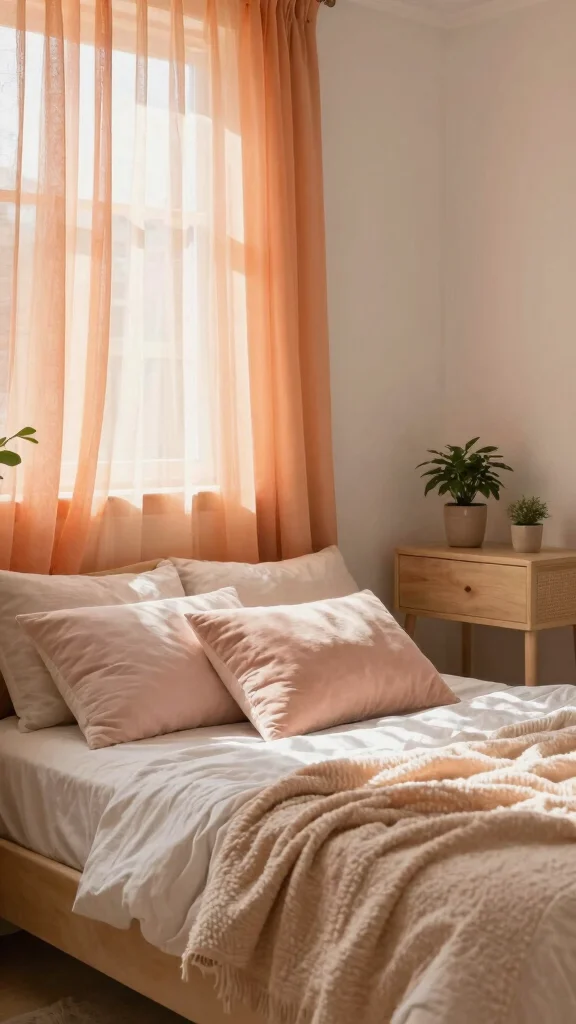 For a serene bedroom oasis, opt for light and airy orange sheer curtains that breathe freshness into your space. These curtains will create a breezy feel, especially when paired with soft pastel accents like mint green or blush pink. When hung strategically, they allow gentle breezes to flow in, providing privacy while inviting natural light. Adding fluffy pillows and textured throws can enhance the cozy vibe, making your bedroom a perfect retreat.