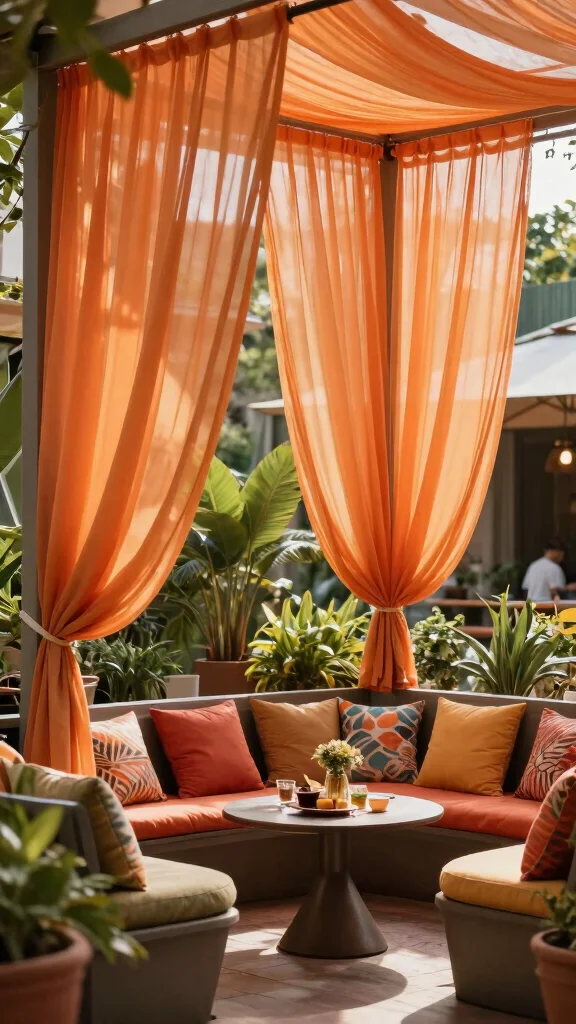 Elevate your outdoor areas with orange sheer curtains that enhance your patio or balcony. These curtains provide a pop of color while offering a touch of privacy, making your outdoor space perfect for morning coffee or entertaining friends. Opt for weather-resistant fabrics to ensure durability and hang them from a stylish rod or frame to create a cozy nook. Pair with comfortable outdoor furniture, vibrant cushions, and potted plants to complete your inviting atmosphere.