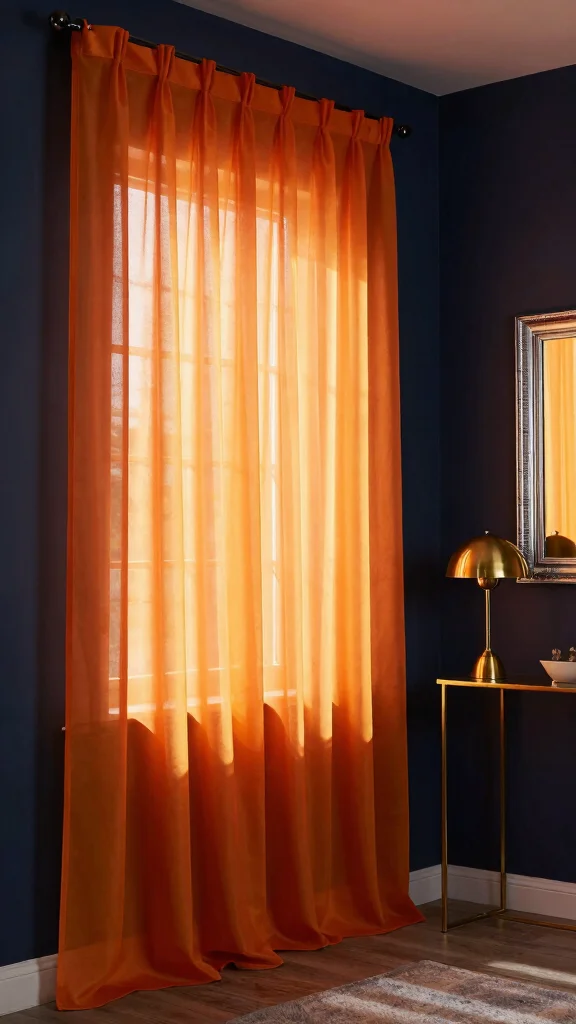 For a daring design choice, pair orange sheer curtains with dark-colored walls to create a striking focal point in any room. Deep navy, charcoal, or rich forest green can provide an elegant backdrop that allows the sheer curtains to pop while still allowing light to filter through beautifully. Enhance this dramatic look with metallic decor elements to tie everything together and elevate the sophisticated vibe.