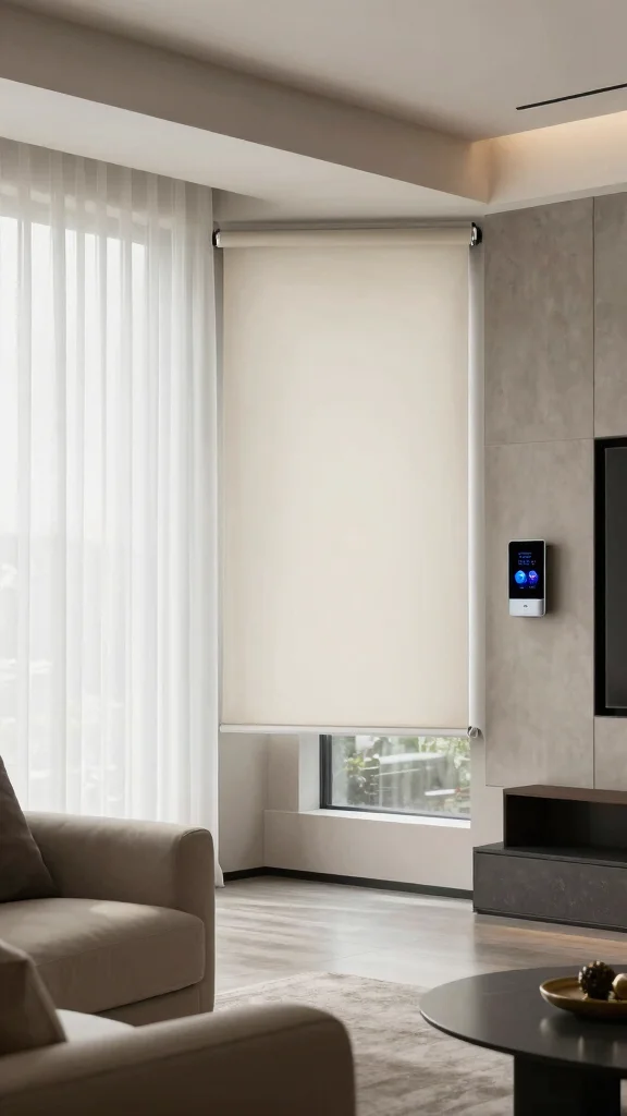 12. Smart Technology: Automated Roller Blinds with Sheer Curtains