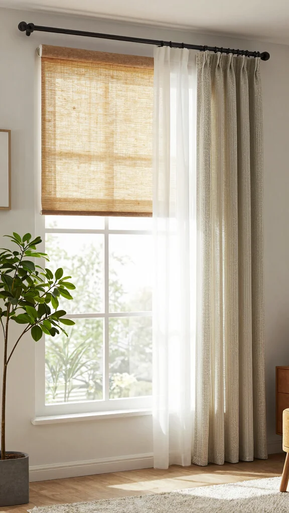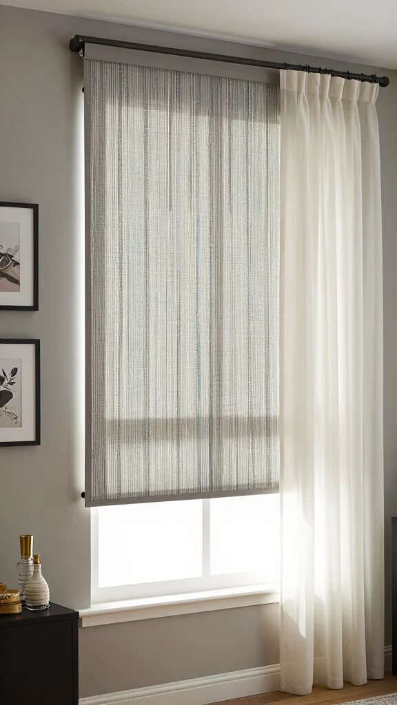 For implementation, select roller blinds with a sleek finish to achieve a modern look. Choose sheer drapes in complementary colors to create visual interest, and consider using tiebacks to enhance the layered appearance when the drapes are not in use.