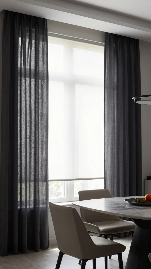 High-contrast combinations make a striking impression in your decor. Light roller blinds paired with dark sheer curtains create a dramatic flair while maintaining a sense of balance. This design works wonderfully in modern interiors, where bold contrasts can elevate the overall aesthetic.