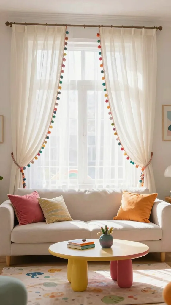 Sheer curtains adorned with pom-pom trim can add a playful touch to your living room decor. This whimsical detail brings a youthful energy to your space, especially when paired with bright colors or cheerful patterns. These curtains add charm while keeping the overall design simple and fun.