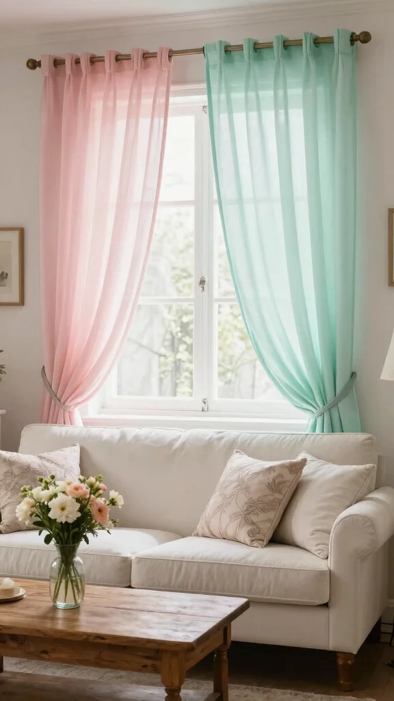 Soft pastel sheer curtains can turn your living room into a romantic sanctuary. Colors like light pink, soft blue, and mint green provide a gentle touch that warms the atmosphere and softens edges, creating a cozy retreat. This delicate palette enhances natural light, making the space feel inviting and serene.