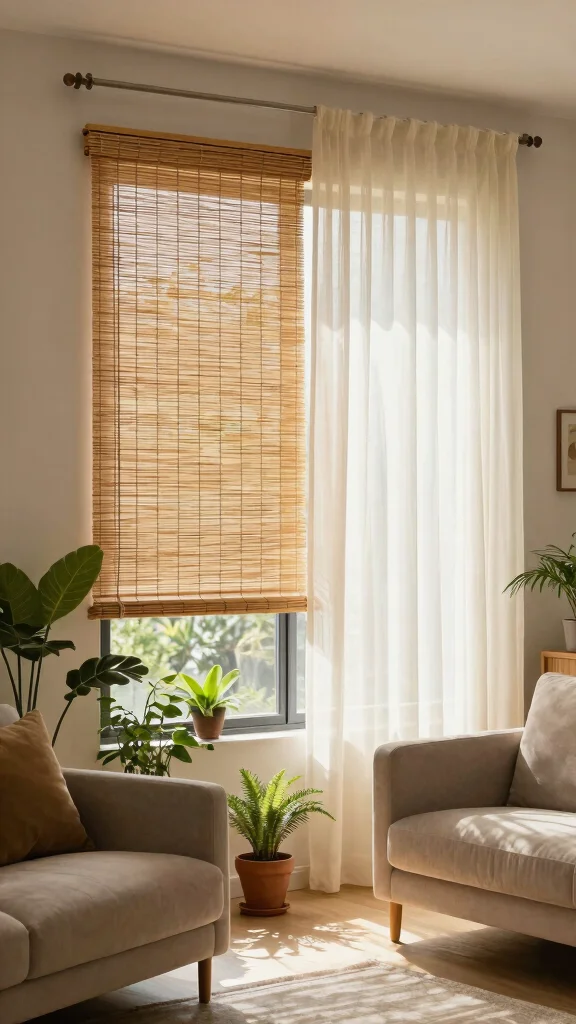 Bamboo shades paired with sheer curtains offer an eco-friendly twist on traditional window treatments. These natural shades provide warmth while blocking harmful UV rays, creating an organic feel in your living room. This combination allows for light diffusion, enhancing your space with a soft glow.