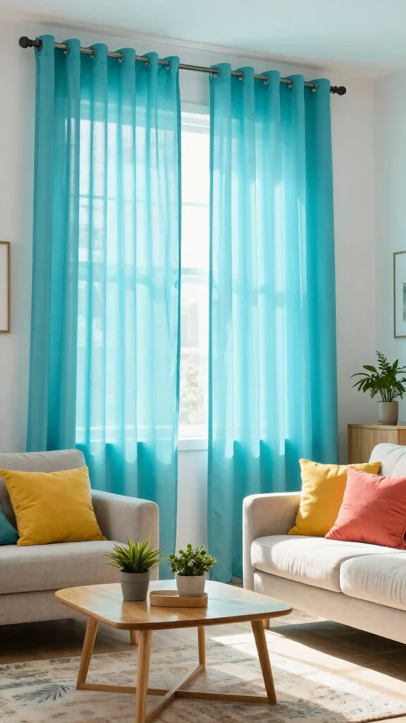 Bright colored sheer curtains can inject energy and vibrancy into your living room. These lively window treatments transform bland spaces into cheerful retreats with bold hues like sunny yellow, teal, or fuchsia. When illuminated by natural light, they create an uplifting atmosphere perfect for relaxation and socializing.