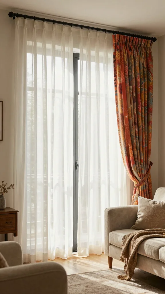 Consider a light, airy sheer paired with rich drapes for contrast, allowing sunlight during the day while maintaining privacy at night.