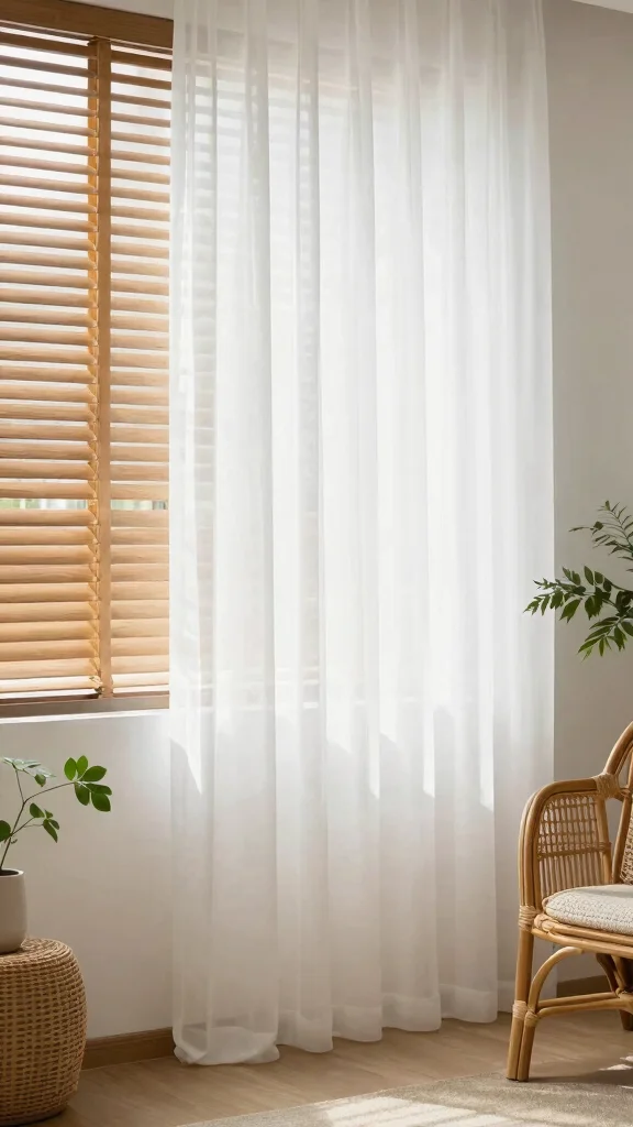 Layer your sheer with a second panel or a light blackout shade for white curtain styles that stay versatile. Pair with natural textures like wood blinds, jute rugs, and green plants to embrace natural light decor. Opt for hardware in matte metals and hang curtains closer to the ceiling to extend the room’s height, a hallmark of minimalist home decor.