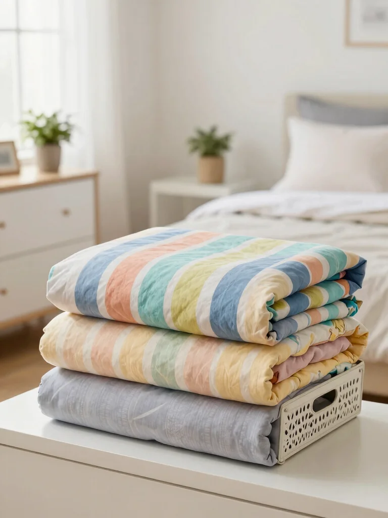 Use vacuum-sealed bags or flat-packed storage to compress off-season bedding.